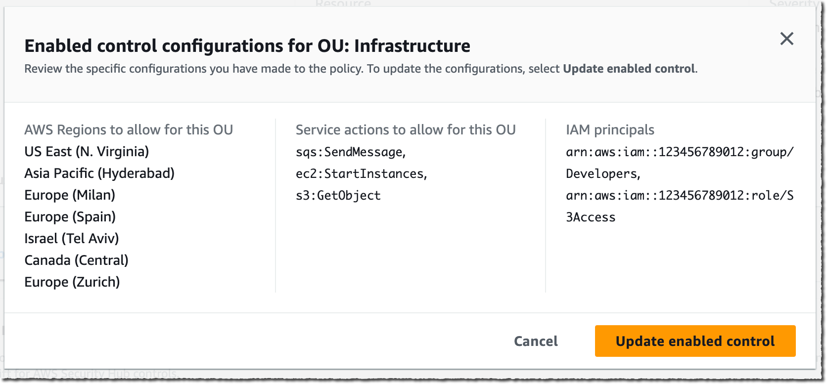 The summary page shows all Regions, APIs, and IAM principals enabled for this OU. All the rest is denied. I can update the parameters at any time.