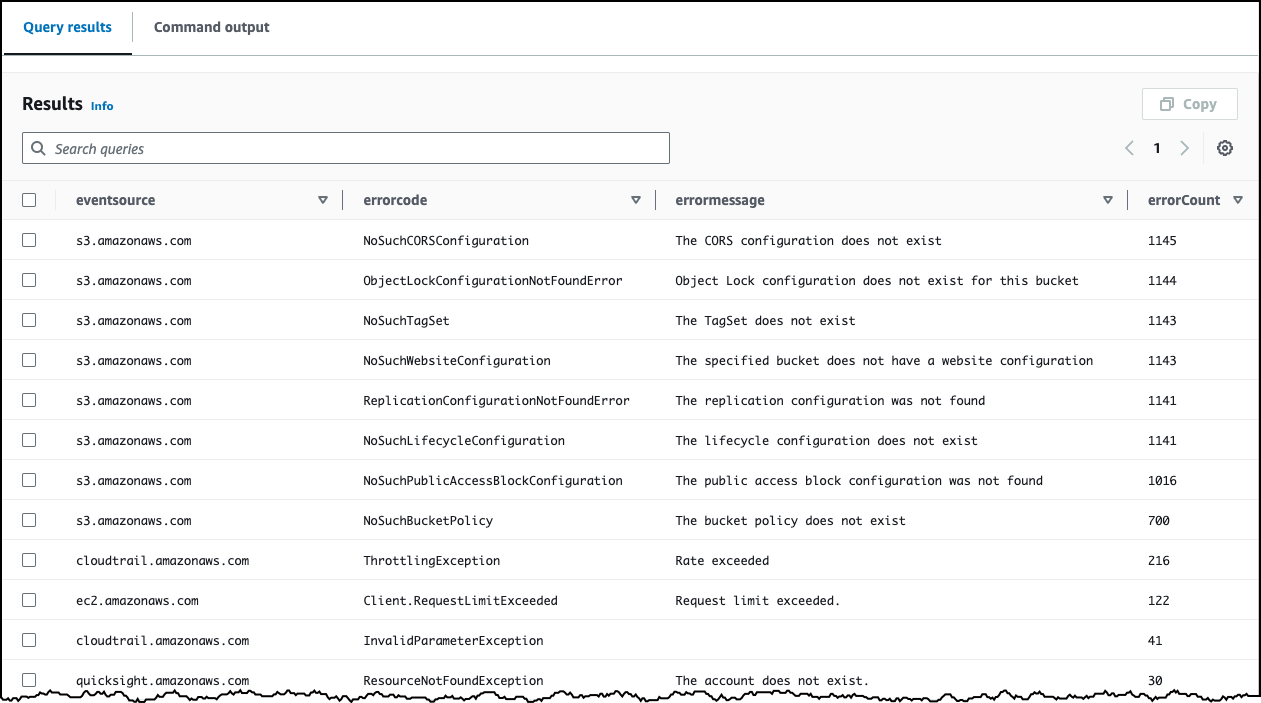 In the results, I see that my account experiences most number of errors related to Amazon S3, and top errors are related to CORS and object level configuration. I can continue to dig deeper to see more details by asking further questions. But now let me give natural language query generator another instruction. I enter the following prompt in the Prompt field: