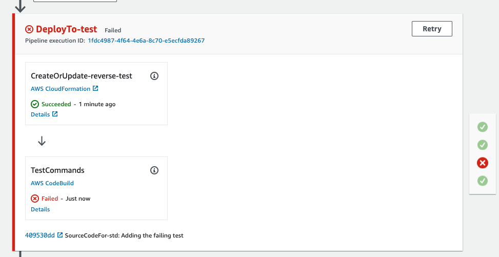 После выполнения git push вы увидите, что конвейер запустил процесс выпуска новой версии, но затем остановился с ошибкой до того, как эта версия попала в производственную среду. Мы можем увидеть больше информации в консоли AWS CodePipeline.