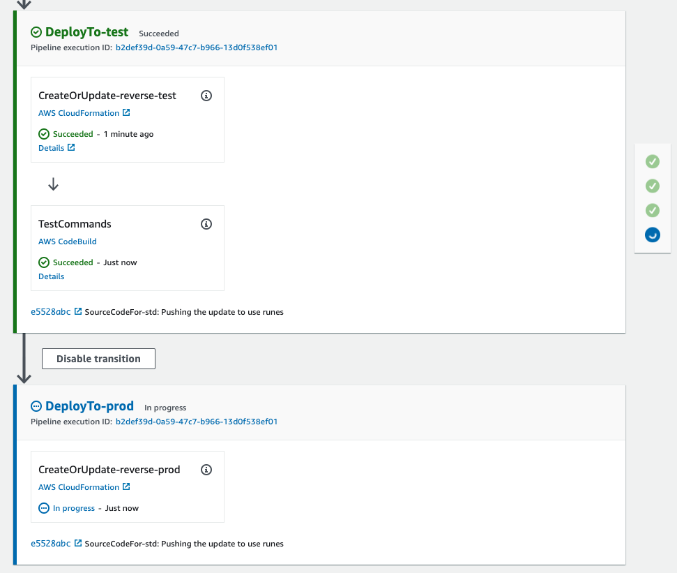 После этого, каждый раз, когда разработчик отправляет изменения кода в Git, приложение сначала устанавливается в тестовой среде, затем запускаются интеграционные тесты, и только если они прошли успешно, код разворачивается в производственную среду, которая используется клиентами. В статусе конвейера можно увидеть новый шаг, который отражает это: