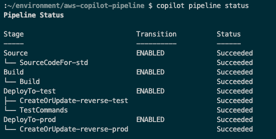 После того, как конвейер создан, вы можете использовать команду copilot pipeline status для просмотра его статуса.