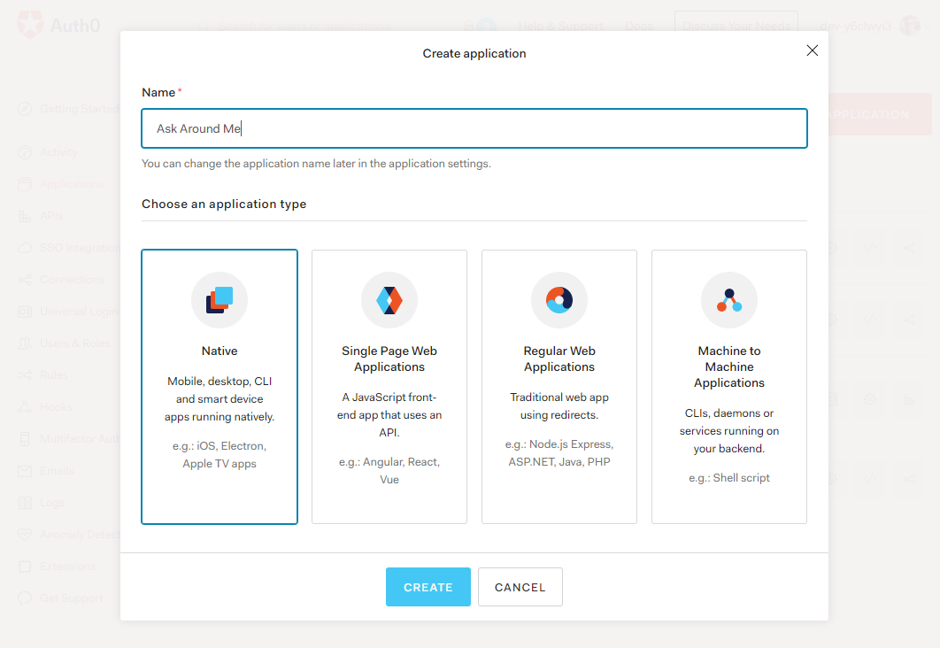 - На главной странице нажмите Create Application. Введите AskAroundMe в качестве названия и выберите Single Page Web Applications в Application Type. Нажмите Create.