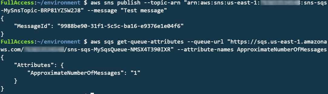 aws sqs get-queue-attributes --queue-url "https://sqs.us-east-1.amazonaws.com/123456789012/sns-sqs-MySqsQueue- ABC123ABC " --attribute-names ApproximateNumberOfMessages
