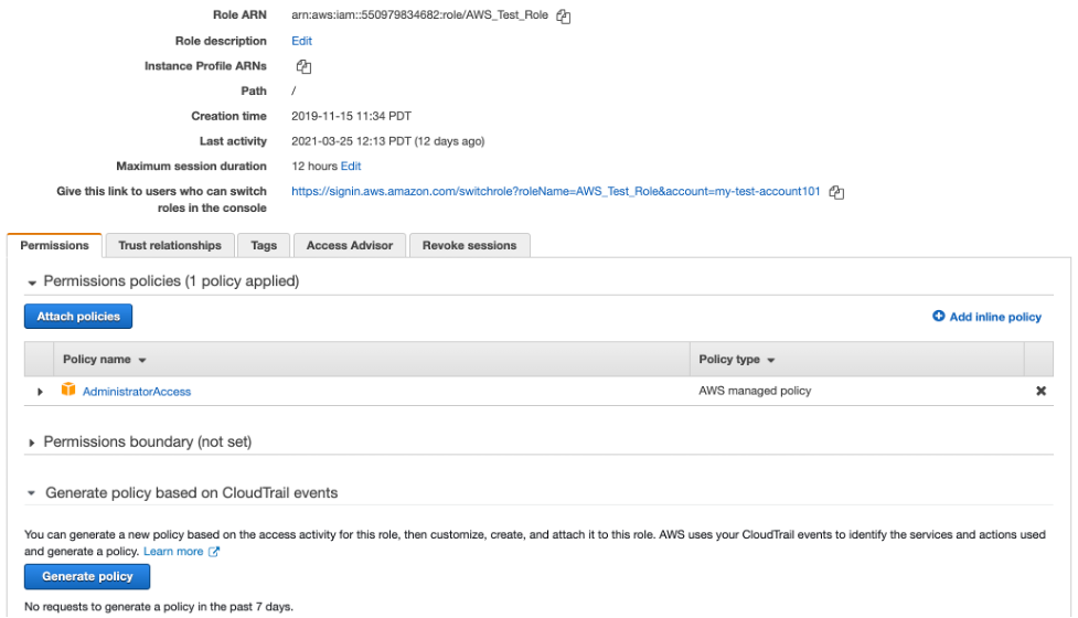 - В разделе Generate policy based on CloudTrail events, выберите Generate policy, как показано на изображении 1.