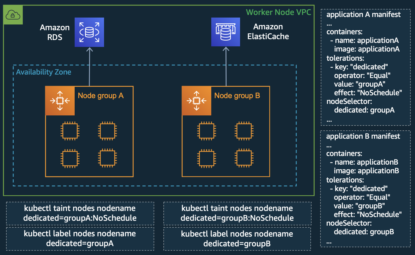 Контейнерные приложения часто требуют доступа к другим сервисам, запущенным в кластере, а также к внешним сервисам AWS, таким как Amazon Relational Database Service (Amazon RDS) или Amazon ElastiCache. В AWS контроль сетевого доступа между сервисами часто осуществляется с помощью групп безопасности EC2. До сегодняшнего дня назначать группы безопасности можно было только на уровне узлов кластера, и все поды, расположенные на одном узле, использовали одинаковые группы. Чтобы обойти это ограничение, приходилось разворачивать отдельные группы узлов (node groups) для каждого приложения и настраивать сложные правила taint и affinity, чтобы поды были запущены на необходимых узлах. Таким неэффективным процессом трудно управлять в больших масштабах, и он может привести к недоиспользованию узлов, как показано ниже.