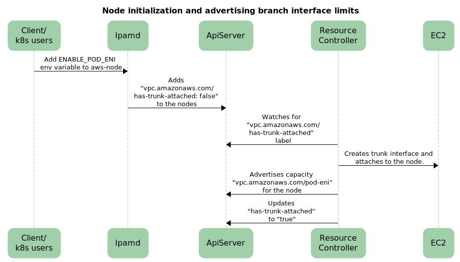 В кластеры Amazon EKS были добавлены два новых компонента: мутирующий webhook и контроллер ресурсов Amazon Virtual Private Cloud (VPC), в котором запущен ваш кластер. Webhook отвечает за добавление значений limits и requests к подам, которым требуются группы безопасности. Контроллер отвечает за управление сетевыми интерфейсами, которые назначены этим подам. Для реализации функции управления группами безопасности на каждый узел будет выделен один сетевой интерфейс trunk и несколько branch-интерфейсов. Trunk-интерфейс работает как обычный сетевой интерфейс, назначенный на инстанс. Контроллер ресурсов VPC затем привязывает branch-интерфейсы к trunk-интерфейсу. Благодаря этому увеличивается количество сетевых интерфейсов, которые могут быть созданы на каждом инстансе. Так как группы безопасности назначаются на сетевые интерфейсы, теперь мы можем создавать поды с необходимыми группами безопасности, используя дополнительные branch-интерфейсы на рабочих узлах кластера. Давайте рассмотрим подробнее, как работает эта функция.