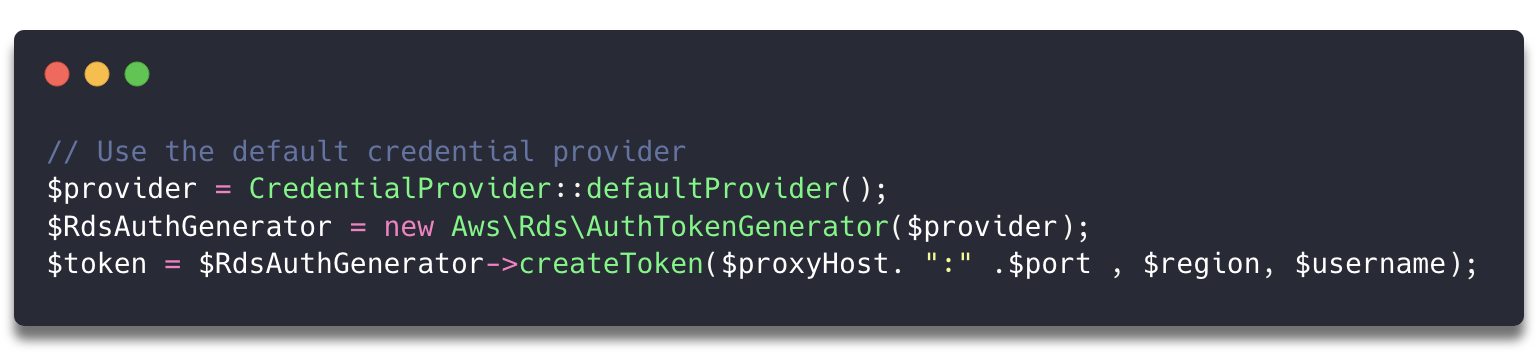 Класс AuthTokenGenerator используется при аутентификации IAM и генерирует токен для аутентификации в RDS. Для его инициализации необходимо передать в конструктор объект credential provider. Затем вызывается метод createToken(), в который в качестве параметров передаются адрес конечной точки прокси, порт, регион и имя пользователя базы данных. Полученный таким образом токен впоследствии используется для подключения к прокси.