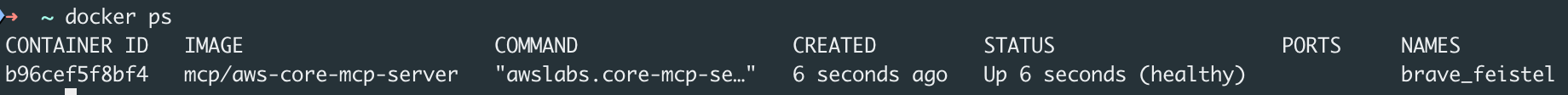 เราสามารถให้ MCP Server ทำงานเป็น Container ได้ ในตัวอย่างนี้จะใช้ AWS Core MCP Server โดยการสร้าง Docker Image จาก MCP Server ที่ต้องการ เช่น AWS Core MCP Server หรือจาก Docker Hub mcp/aws-core-mcp-server