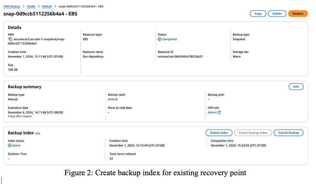 ในการใช้ฟีเจอร์ใหม่นี้ AWS Backup ได้เพิ่มความสามารถโดยการสร้าง Index ของข้อมูลทั้งหมด หรือบางส่วนที่ทำการ backup ของ Amazon EBS snapshot และ Amazon S3 backups โดย Index ที่จัดเก็บจะมีข้อมูล catalogs และ metadata ที่มีการ backup ทำให้คุณสามารถค้นหารายการต่าง ๆ โดยใช้คุณสมบัติ(properties) เช่น เวลาที่สร้าง(create time), ขนาด(item size), file path และ object key แต่ AWS Backup จะไม่ทำ index ของเนื้อหา(contents)ของไฟล์ เพื่อรักษาความเป็นส่วนตัวของข้อมูลของคุณ เมื่อคุณค้นหาและพบรายการที่ต้องการหรือไฟล์แล้ว คุณสามารถเลือกจะกู้คืนรายการที่เลือกได้ ซึ่งช่วยลดเวลาในการทำงานที่ยุ่งยาก เช่น ไม่จำเป็นต้องกู้คืนไฟล์ทั้งหมดแล้วค่อยค้นหา