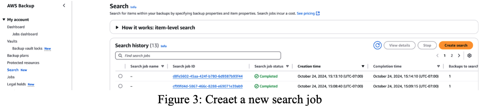 เมื่อการสร้าง Index เรียบร้อยแล้ว คุณสามารถค้นหารายการหรือไฟล์ที่ recovery point ที่มีการทำ index เอาไว้หรือค้นหารายการหรือไฟล์ที่ต้องการจากหลาย recovery point ได้เช่นกัน โดยเลือกไปที่เมนู search ทางด้านซ้ายของ AWS backup console ตามรูปที่ 3