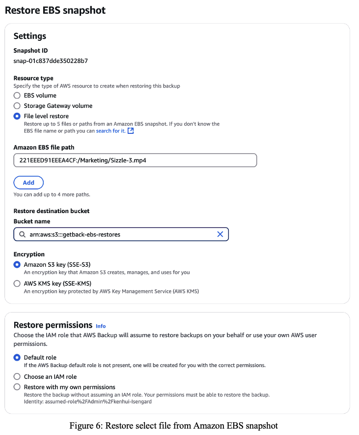 หลังจากนั้นคุณสามารถระบุ parameters ต่างๆที่อยากจะค้นหาโดยในตัวอย่างจะทำการค้นหาไฟล์ MP4 ที่ชื่อว่า Sizzler จากหลาย Amazon EBS recovery point โดยระบุ create date อยู่ระหว่าง วันที่ October 27th, 2024 ถึงวันที่ October 31st, 2024. และระบุชื่อไฟล์ที่มีชื่อว่า Sizzle โดยดูจาก file paths ดังรูปที่ 4