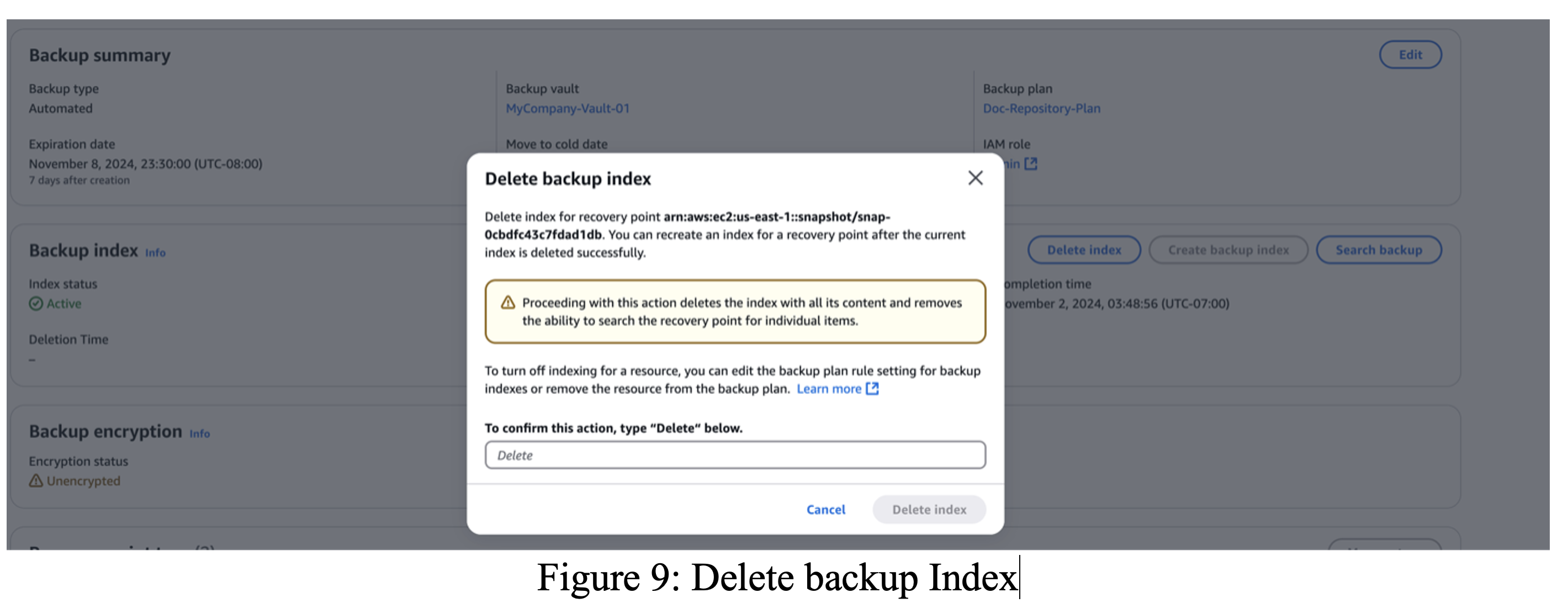 ถ้าต้องการทำการลบ index ที่ไม่จำเป็นต้องใช้งานแล้ว คุณสามารถไปลบ index เพื่อหลีกเลี่ยงค่าใช้จ่ายเพิ่มเติม โดยสามารถเข้าไปลบ index ได้จากหน้า Recovery point ตามรูปที่ 9