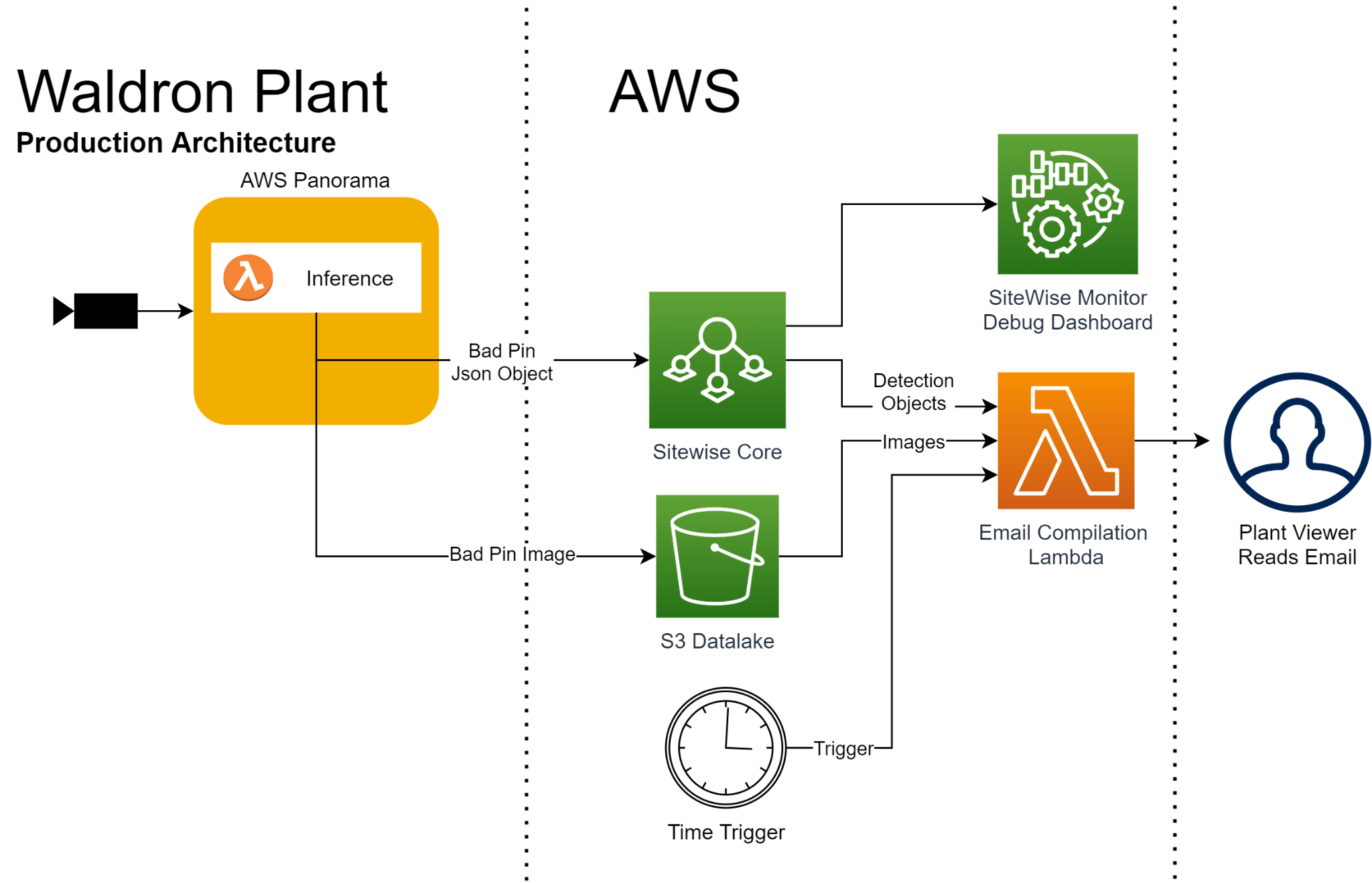 Sistem bir anomali algıladığında, arızalı pimi içeren görüntü depolama için Amazon S3’ye gönderilir ve bununla ilişkili meta veriler AWS IoT SiteWise‘a gönderilir. Her vardiyanın sonunda bir EventBridge olayı, tesis personeline özet e-posta göndermek için görüntüleri ve meta verileri kullanan bir Lambda işlevini tetikler. Tesis personeli vardiya değişimi sırasında onarım yaparken bu bilgileri kullanır.