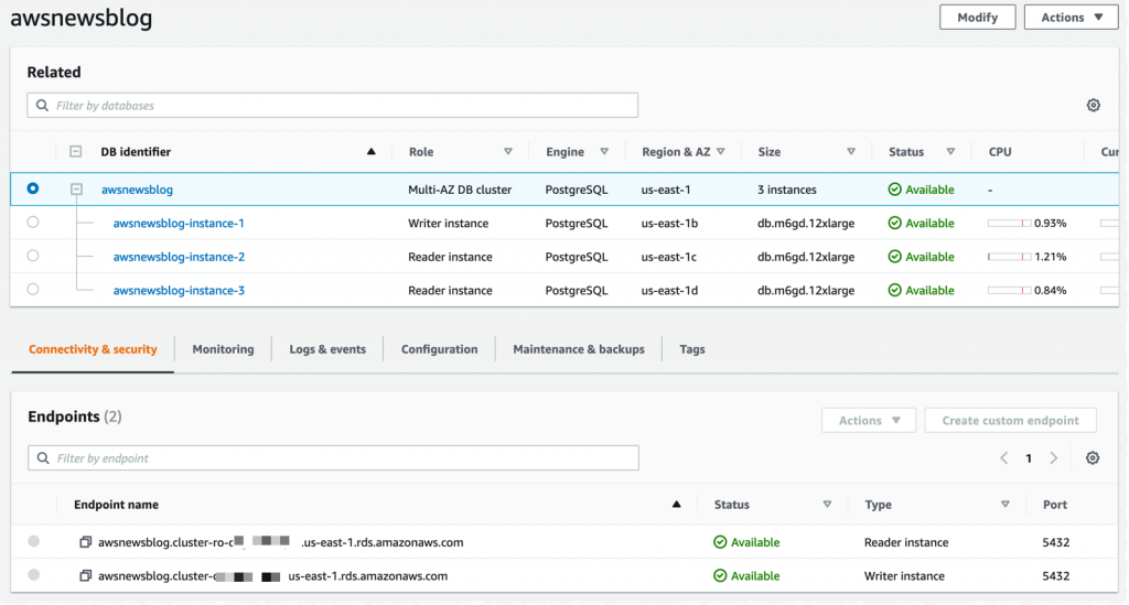 Başlatıldıktan sonra, üç DB sunucusunun oluşturulduğunu doğruluyorum. Ayrıca Amazon RDS tarafından sağlanan iki uç noktayı da not alıyorum: birincil uç nokta ve iki okunabilir yedek bulut sunucusu için bir yük dengeli uç nokta.