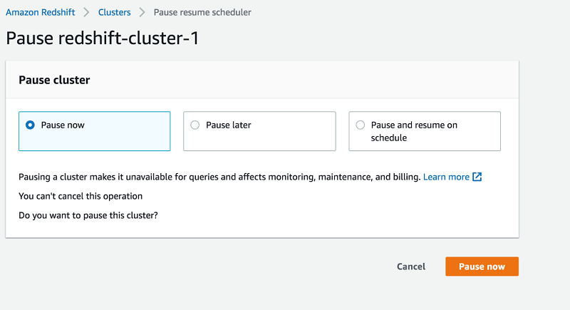 Bir kümeyi duraklatmak işlemi askıya alır ve temel alınan veri yapılarını ve verileri korur, böylece kümeyi daha sonra devam ettirebilirsiniz. Bunu Amazon Redshift konsolu veya Amazon Redshift CLI’larını kullanarak yapılandırabilirsiniz.
