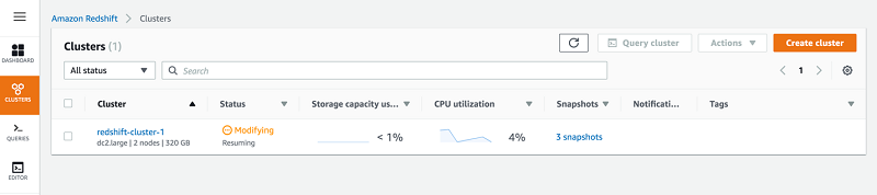 - Amazon Redshift konsolunda Clusters’ı seçin.