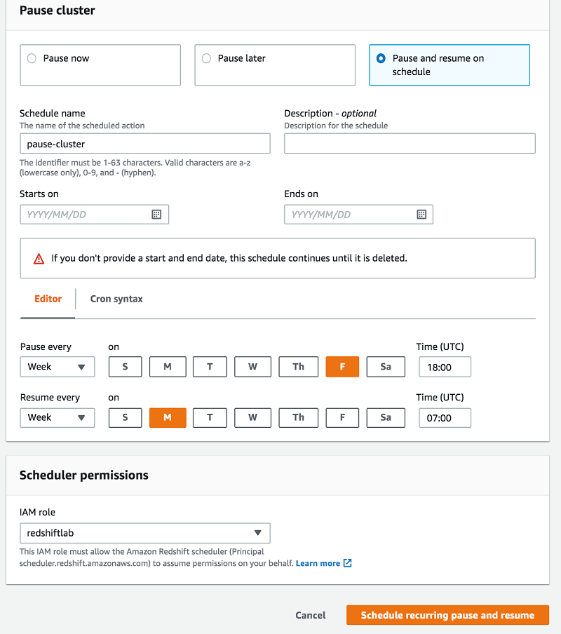 Günün ve haftanın belirli saatlerinde bir kümeyi duraklatmak ve devam ettirmek için zamanlayabilirsiniz. Örneğin bu çözüm, bir kümeyi Cuma 20:00’de duraklatır ve Pazartesi 07:00’de devam ettirir. Bunu Amazon Redshift konsolu veya API’leri aracılığıyla yapılandırabilirsiniz.