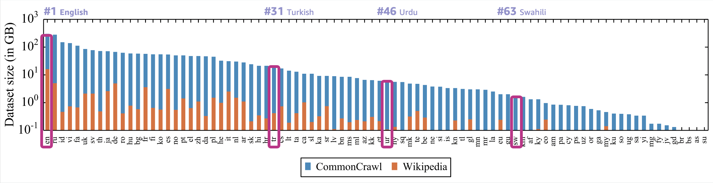 Aşağıdaki şekil, 80’den fazla dilin ISO kodlarını ve iki ana ön eğitim arasındaki boyut farkını (log ölçeğinde) belirtir [7]. Wikipedia’da (turuncu), 1 milyondan fazla makale içeren sadece 18 dil ve 1.000’den fazla makale içeren 52 dil, ancak yalnızca 1–10.000 makale içeren 164 dil vardır [9]. CommonCrawl corpus (mavi), düşük kaynaklı diller için veri miktarını iki büyüklük sırası artırır. Bununla birlikte, İngilizce, Rusça veya Almanca gibi yüksek kaynaklı dillere kıyasla hala nispeten küçüktürler.