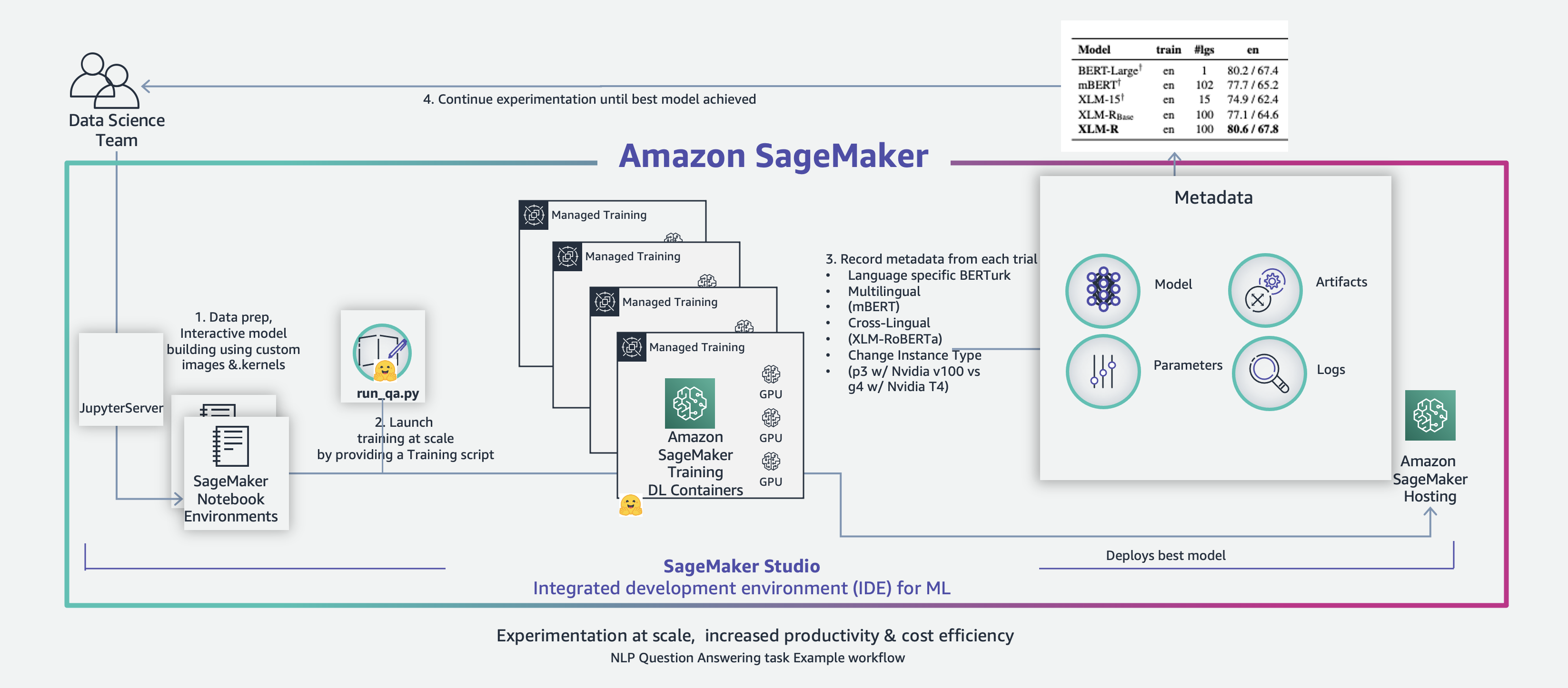 Amazon SageMaker‘da Hugging Face dönüştürücülerini kullanmanın çeşitli faydalarını, örneğin geniş ölçekte eğitim ve deneme, artan üretkenlik ve maliyet verimliliğini gösteriyoruz.
