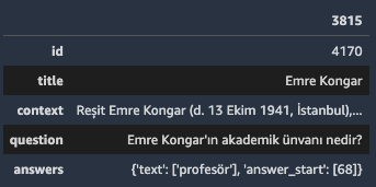 Hugging Face Veri Kümeleri kitaplığı, bir derin öğrenme modelinde bir veri kümesini eğitime hızlı bir şekilde hazırlamak için güçlü veri işleme yöntemleri sağlar. Aşağıdaki kod, Türkçe QA veri setini yükler ve içindekileri araştırır:
