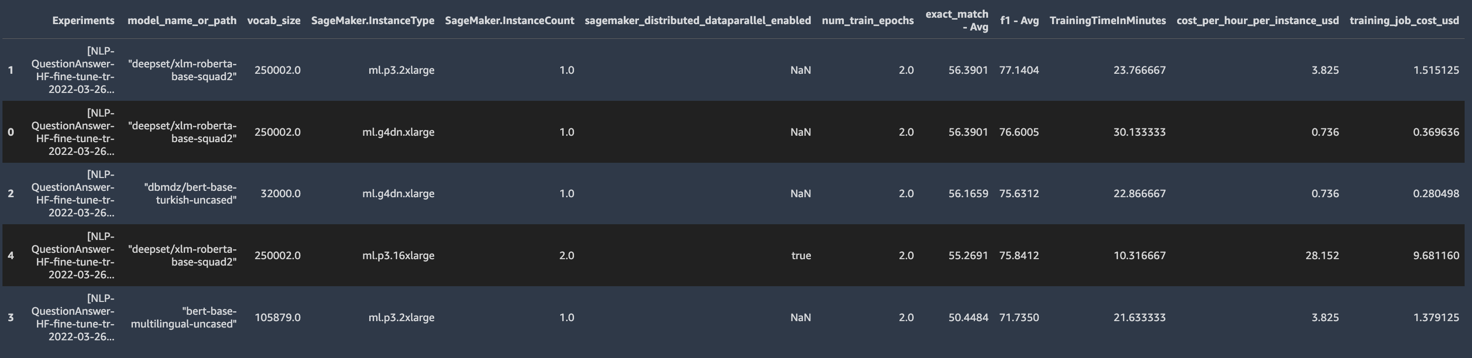 SageMaker, çok çeşitli eğitim örneği türleri sağlar. XLM-R modelinde p3.2xlarge (GPU: Nvidia V100 GPU, GPU mimarisi: Volta (2017)), p3.16xlarge (GPU: 8 Nvidia V100 GPU) ve g4dn.xlarge (GPU: Nvidia T4 GPU, GPU mimarisi: Turing (2018)) üzerinde ince ayar yaptık ve şunları gözlemledik: