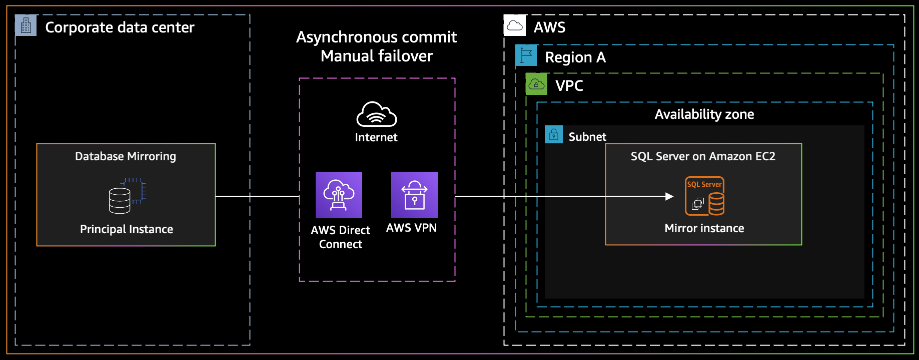 SQL Server veritabanlarınız için bir hibrit bulut ortamı kurmak için veritabanı yansıtmayı kullanabilirsiniz. Bu seçenek, SQL Server Enterprise sürümünü gerektirir. Bu senaryoda, ana SQL Server veritabanınız şirket içinde çalışır ve bulutta sıcak bir bekleme oluşturursunuz. Verilerinizi eşzamansız olarak çoğaltır ve kesmeye hazır olduğunuzda manuel yük devretme gerçekleştirirsiniz. Veritabanını AWS Cloud’a taşıdıktan sonra, yüksek kullanılabilirlik ve dayanıklılık amaçları için Her Zaman Açık (Always On) kullanılabilirlik grubu kullanarak ikincil bir çoğaltma ekleyebilirsiniz.