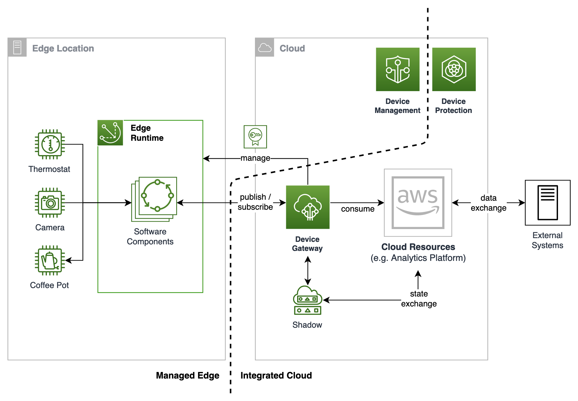 Sensörler ile etkileşim veya gecikmeye hassas veri işlemi gibi görevler yerel kalmalıdır. Bir uç çalışma zamanı ve bulut hizmeti olan AWS IoT Greengrass, cihazları ve cihaz yazılımını güvenli bir şekilde yöneterek uzaktan bakım ve güvenli OTA güncellemeleri sağlar. IoT cihazlarını güvenli bir şekilde kaydeden, organize eden, izleyen ve yöneten AWS IoT Core ve AWS IoT Device Management‘ın yeteneklerini geliştirir ve genişletir.