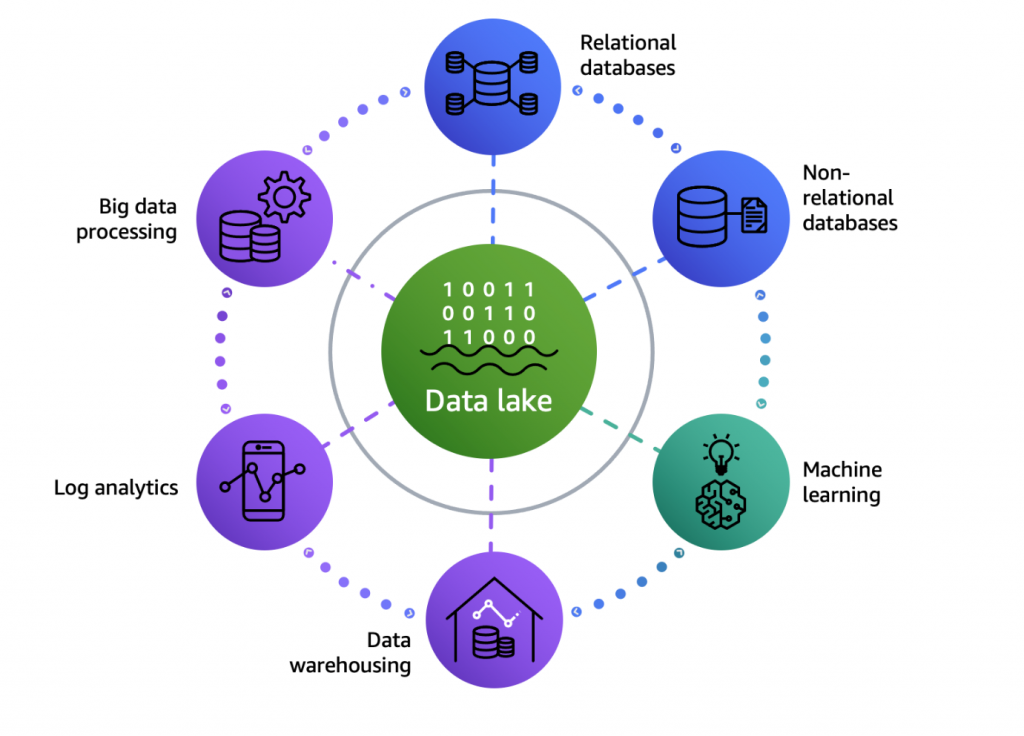 AWS veri gölü mimarisi, aşağıdaki şekilde gösterildiği gibi verileri bir veri gölünde depolamanıza ve göl çevresinde amaca yönelik olarak oluşturulmuş veri hizmetleri halkasını kullanmanıza olanak tanıyan modern bir veri mimarisidir. Bu, hızlı ve çevik, geniş ölçekte ve uygun maliyetli kararlar vermenizi sağlar. Daha fazla ayrıntı için AWS’te Modern Veri Mimarisi‘ne bakın.