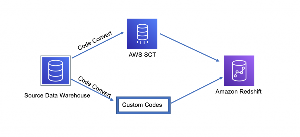 Veri ambarı geçişi, geçiş sürecini desteklemek için bir dizi hizmet ve araç içerir. Bir veritabanı geçişi değerlendirme raporu oluşturmaya ve ardından AWS SCT kullanarak kaynak veri şemasını Amazon Redshift ile uyumlu olacak şekilde dönüştürmeye başlarsınız. Verileri taşımak için AWS Data Migration Service (AWS DMS) görevleri oluşturmak ve yönetmek ve veri geçişini düzenlemek için AWS DMS ile entegrasyona sahip AWS SCT veri çıkarma aracını kullanabilirsiniz.
