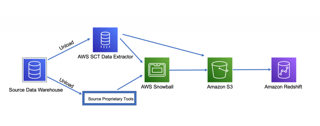 Bu adımda, ilk veri çıkarma işlemini tamamlar ve kaynak verileri Amazon Redshift’e ilk kez yüklersiniz. Veri boyutunuz ve veri aktarım gereksinimleriniz birbirine bağlı ağ üzerinden veri aktarmanıza izin veriyorsa, kaynak veri ambarından veri çıkarmak ve verileri Amazon S3’ye yüklemek için AWS SCT veri çıkarıcıları (AWS SCT data extractors) kullanabilirsiniz. Alternatif olarak, ağ kapasite sınırı gibi sınırlamalar varsa, Snowball’a veri yükleyebilirsiniz ve oradan veriler Amazon S3’ye yüklenir. Kaynak veri ambarındaki veriler Amazon S3’de kullanılabilir olduğunda Amazon Redshift’e yüklenir. Kaynak veri ambarı yerel araçlarının AWS SCT veri çıkarıcılarından daha iyi bir veri boşaltma ve yükleme işi yaptığı durumlarda, bu adımı tamamlamak için yerel araçları kullanmayı seçebilirsiniz.