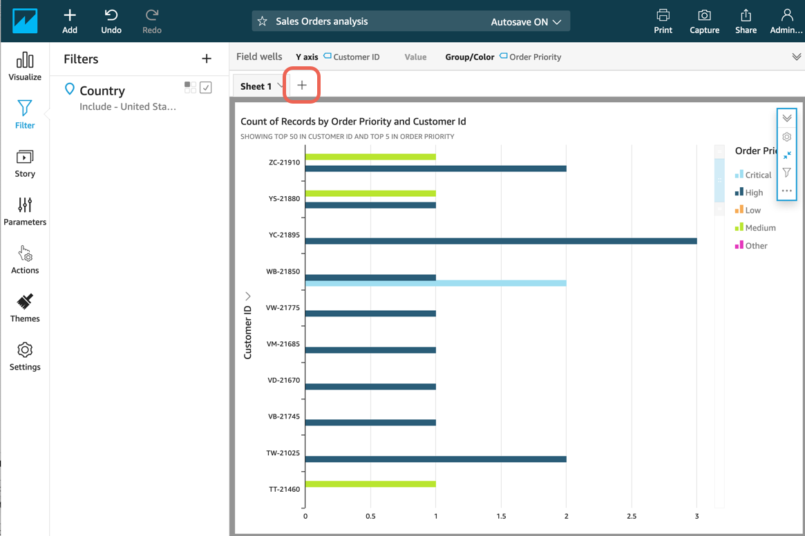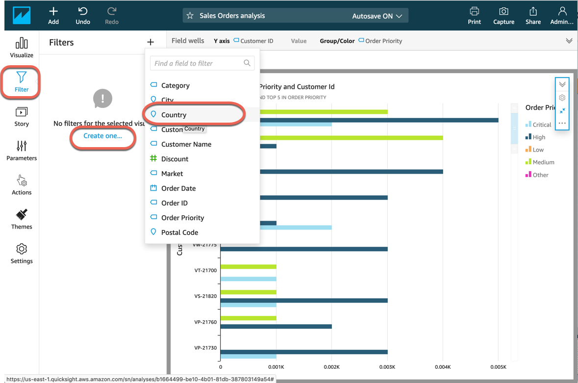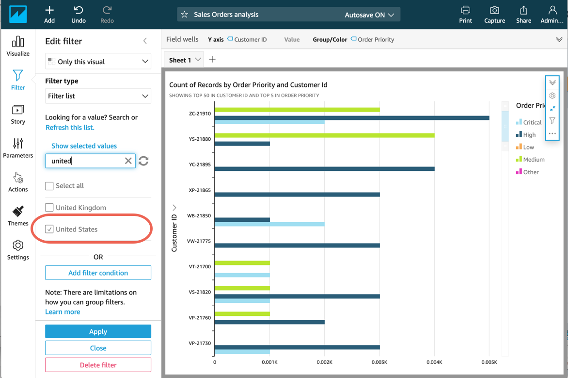 c. Düzenlemek için Ülke filtresini seçin. Filtreyi düzenle iletişim kutusunda, Amerika Birleşik Devletleri onay kutusunu işaretleyin ve Uygula’yı seçin. Ardından Kapat’ı seçin. Şimdi önceliğe ve müşteri kimliğine göre kayıtların sayısı yalnızca Amerika Birleşik Devletleri için görüntülenir.