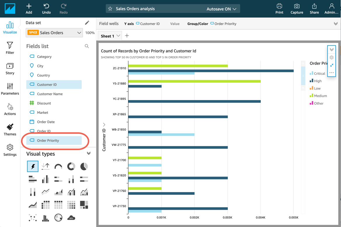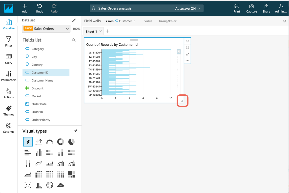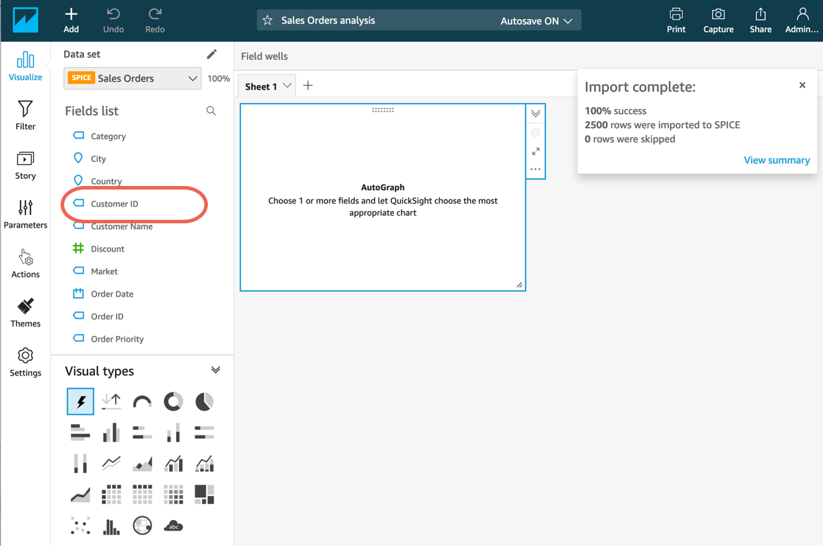 Analizde ilk görseli oluşturmak için bu adımları uygulayın. Bu adımda, Müşteri Kimliği alanını temel alan bir görseli dinamik olarak oluşturmak için AutoGraph kullanırsınız.