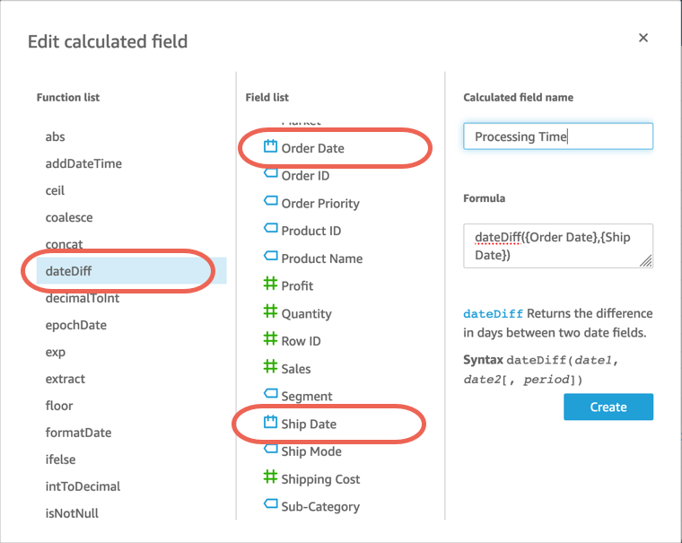 b. Hesaplanan alanı düzenle iletişim kutusunda, İşlevler listesinde dateDiff’i seçin. Ardından Alan listesi bölümünde Sipariş Tarihi’ni seçin, virgül yazın ve Gönderim Tarihi’ni seçin. Hesaplanan alan bölümünü İşleme Süresi olarak adlandırın. Yeni hesaplanan alanınızın formülü dateDiff({OrderDate},{ShipDate}) olarak görünmelidir. Oluştur’u seçin.