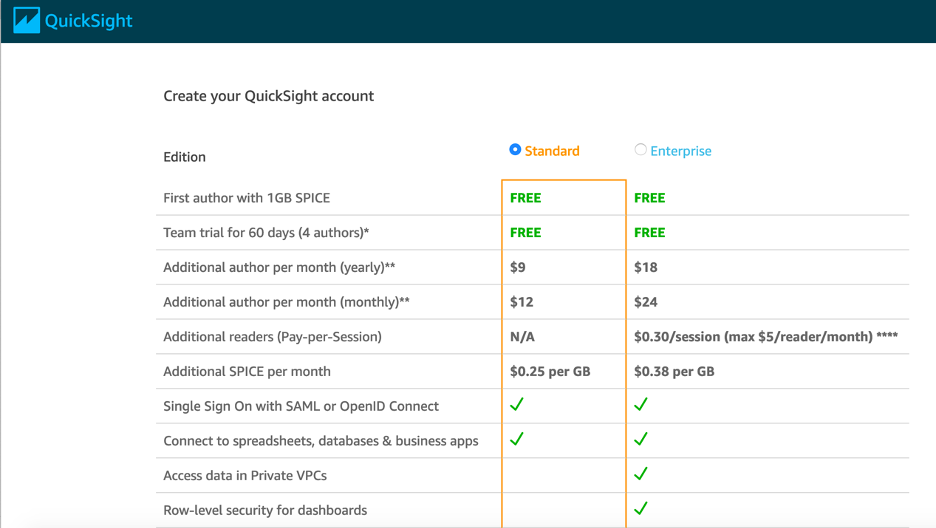 d. QuickSight kullanımını ve aboneliğini yönetme: QuickSight deneme sürümü, SPICE kapasitesi, okuyucu ekleme veya aboneliğinizi yönetme hakkında bilgi için bkz. Amazon QuickSight Kullanımını Yönetme. Amazon QuickSight 60 günlük deneme sürümünden sonra fiyatlandırma hakkında bilgi için bkz. Amazon QuickSight Fiyatlandırması.