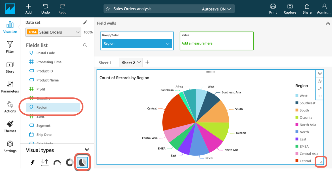 b. Görsel türleri için Pasta grafiği seçeneğini belirleyin ve Alanlar listesinde Bölge’yi seçin. Sağ alt köşeyi seçip sürükleyerek çalışma alanını yeniden boyutlandırın.