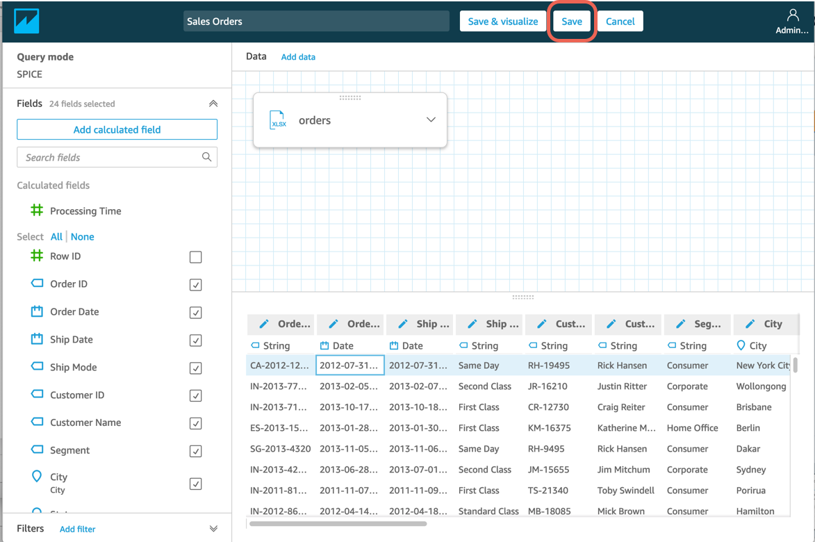 Bu öğreticide, veri kümesi oluşturmayı, verileri hazırlamayı, analiz oluşturmayı, görsel oluşturmayı, görseli değiştirmeyi, daha fazla görsel eklemeyi, hikayeye sahne eklemeyi, pano olarak yayınlamayı ve AWS kaynaklarınızı silmeyi öğreneceksiniz. Bu öğretici sırasında kullanımınız için örnek bir veri kaynağı sağlanmıştır ve indirilmeye hazırdır: Satış Siparişleri.xlsx.zip. Bu veri kaynağı, Kaggle’da Global Superstore veri kümesi olarak herkesin kullanımına açıktır.